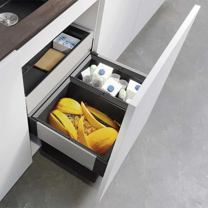 The SELECT 60/2 Orga not only benefits from featuring the largest single container in the Blanco waste range, but has the revolutionary Organiser draw accessory sitting atop. Allowing you to fully utilise the space within a 600mm base unit. The unit is designed to be fitted behind pull-out doors and features a sturdy steel frame, and the elegant colour scheme enhances the look. The containers lift out easily, with neatly designed handles which come up to 90 degrees and are easy to clean.