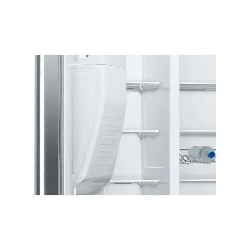 Ideal for large families, this Bosch American fridge freezer has a 531 litre capacity, so it can hold up to 29 grocery bags filled with all your favourite foods. This American fridge freezer is supplied with a freezer and refrigeration section. The VarioZone feature, which lets you move the freezer drawers around to fit bulkier items is ideal for fitting in larger cuts of meat. The plumbed water and ice dispenser gives you cold water on tap. For peace of mind this frost free freezer circulates cool air constantly to stop icy build-ups, meaning you’ll never have to do a manual defrost again.