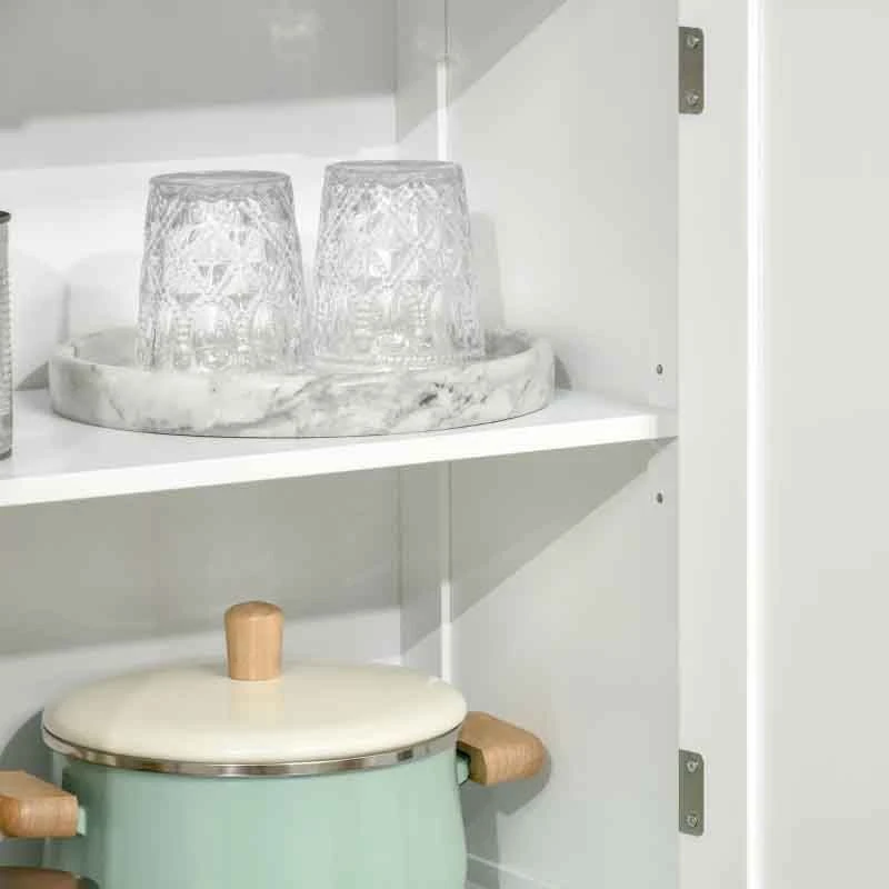 This HOMCOM pantry cupboard offers a wide range of storage possibilities. This storage unit’s clean, white design is multifunctional, with beadboard door panels, glass panels, and metal handles for a streamlined appeal.
