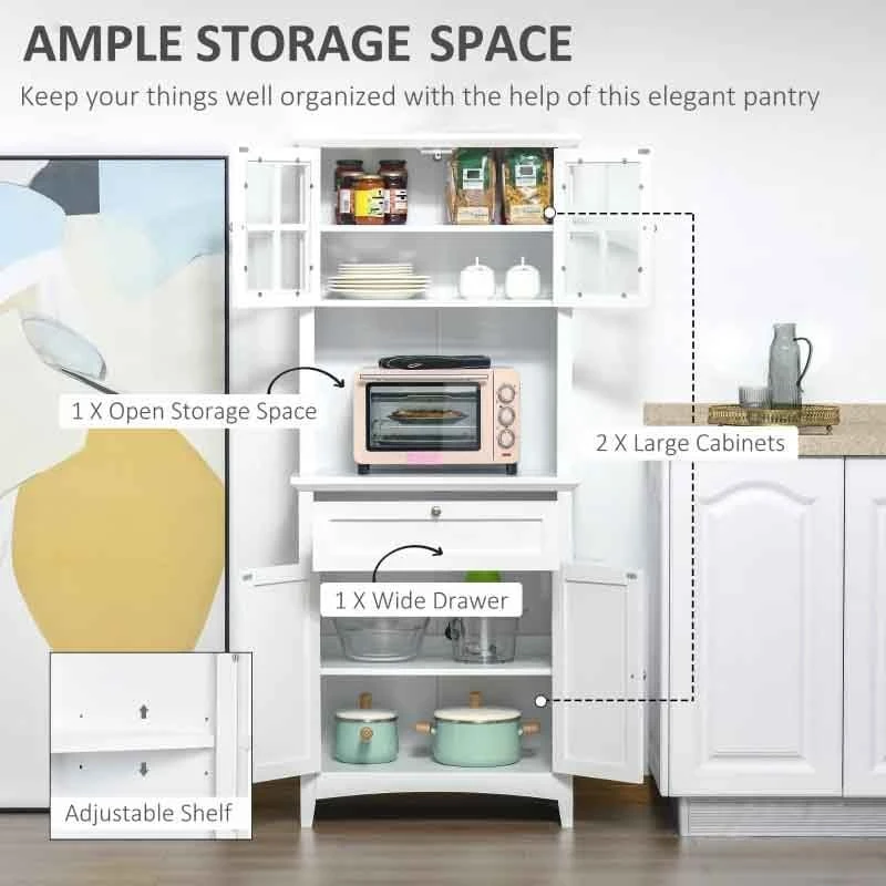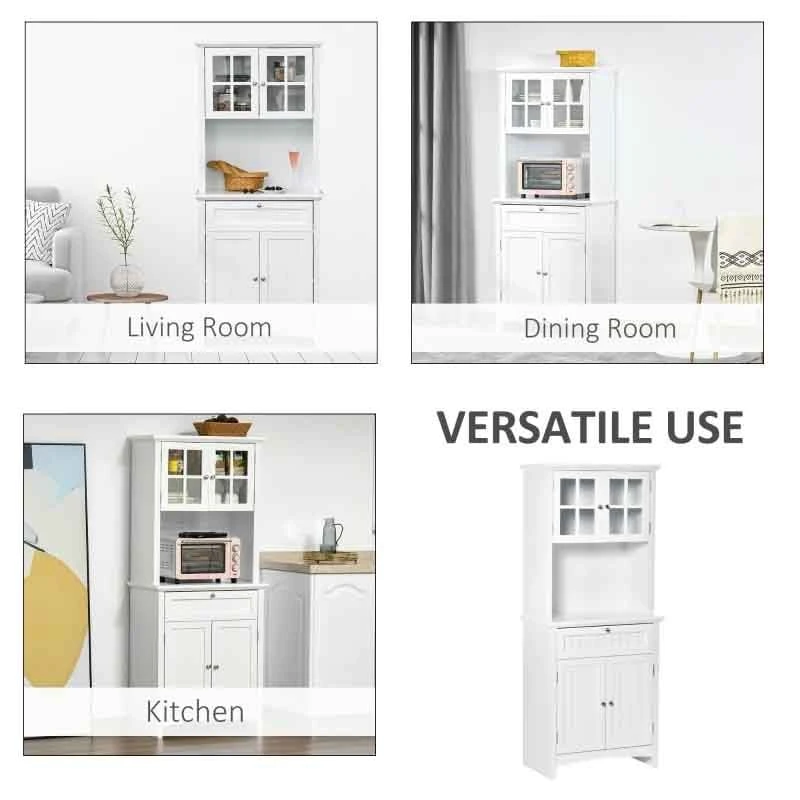 This HOMCOM freestanding kitchen cabinet offers ample storage space with two separate cabinets, an open middle area, and a wide drawer. The top cabinet features glass panel doors for easy visibility, while both spaces have adjustable shelves. The MDF structure is durable, finished with a smooth coat of paint and anti-tipping straps for safety.