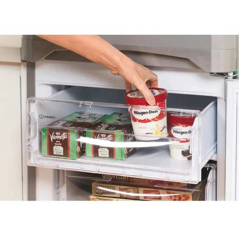 An ideal combination for busy households, the Indesit freestanding fridge freezer offers a space-saving solution to take care of your refrigeration and freezing needs in one go. 154L of cooling space is distributed across three glass shelves making storing and organising a breeze, with a dedicated Crisper drawers for delicate salads and fruit. Within the freezer cabinet, enjoy 100L of space with three deep, clear-fronted drawers to store your essentials and stockpiled produce.