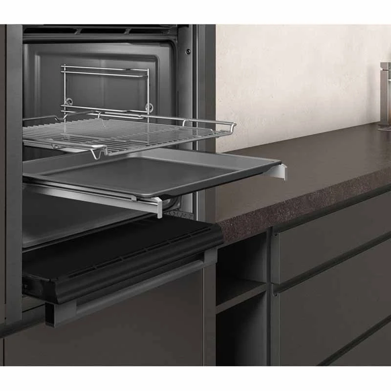 A Built In Single Electric Oven in Graphite Grey. Whether you’re preparing a snack for the kids, cooking a big dish for a get-together or just grilling some fresh fish for lunch, the Neff Slide and Hide Electric Oven has six cooking functions to choose from. This versatile oven also has a large capacity of 71 litres giving you more than enough room for big bakes and family-sized roasts. Clip-on rails make it easy to adjust the shelves, so that you can fit a variety of different sized dishes and pots into the oven to create delicious meals.
