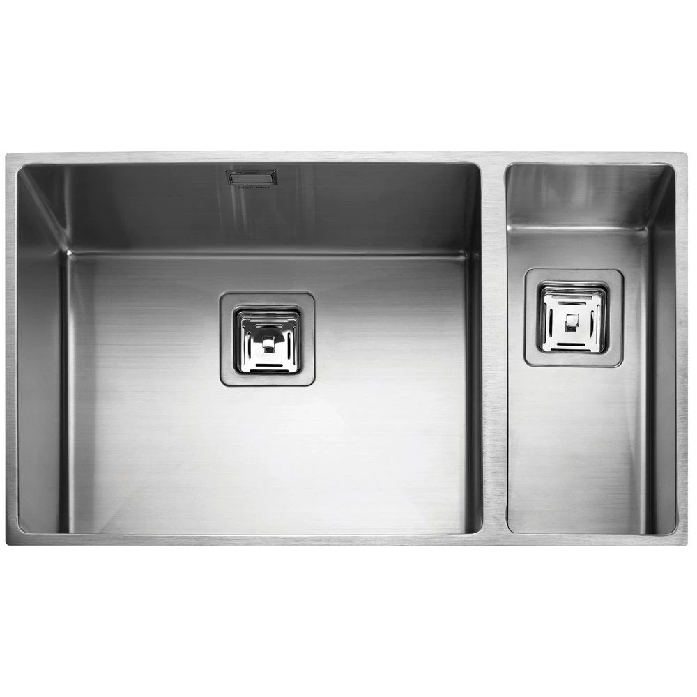 The Rangemaster Atlantic Kube 1.5 Bowl with Right Hand Small Bowl Stainless Steel Undermount Kitchen Sink creates a geometric effect thanks to its dramatic 10mm radii corner profiling and modern square waste and overflow design.