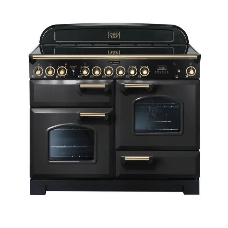 The Rangemaster Classic Deluxe 110 Ceramic Cooker in Charcoal Black/Brass is a fantastic addition for brining into many kitchen design with the style to match the rest of your appliances and accessories. Creating a high quality finish, the Classic Deluxe brings a traditional finish with the addition of professional benefits of a range cooker making it easier for your cooking needs. With 2 ovens and a ceramic hob, the Classic Deluxe 110 can be added to any kitchen space to create a cooking area for families or those who love to entertain and need more cooking facilties to match their needs.